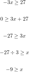 Divide both sides by negative 3. Whenever you multiply or divide by a negative number with an inequality you have the change the direction of the inequality sign. Twenty-seven divided by negative three is negative nine on the right side. The answer here is x ≤ -9.