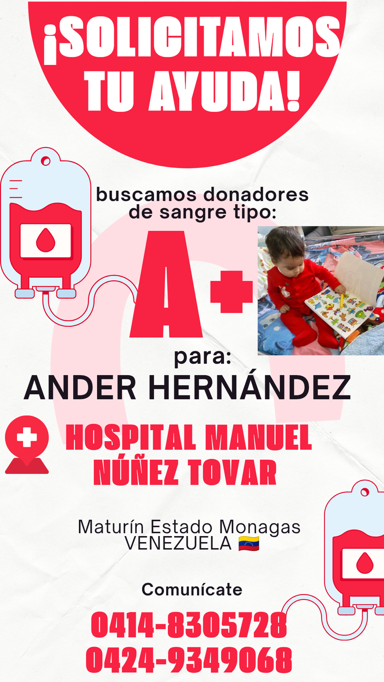 Ander's current illness, the child for whom I requested blood donors a couple of days ago, began when Ander was 15 months old. It started with fever, diarrhea, and jaundice (yellow skin and eyes). It all looked like a virus, so they took him to the pediatrician, who prescribed an antibiotic (cefotaxime) and ordered a blood test. The results showed a hemoglobin level of 7.7, but the high fevers continued. When the doctor was informed, he instructed them to go to Maturín for another blood test and a chest X-ray. By that time, Ander's hemoglobin had already dropped to 5.5. It was then that they went to the hospital where he is currently being treated. That is where the whole process began.
