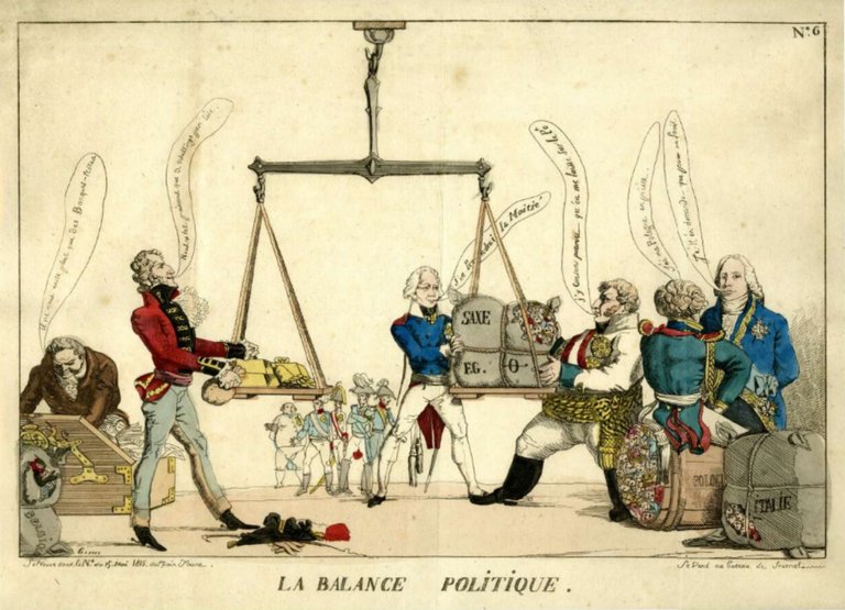 - The Political Balance: La Balance Politique, Eugène Delacroix (attributed), Caricature to Accompany Le Nain Jaune, 15 May 1815, Pages 191-192, © The Trustees of the British Museum, Creative Commons License