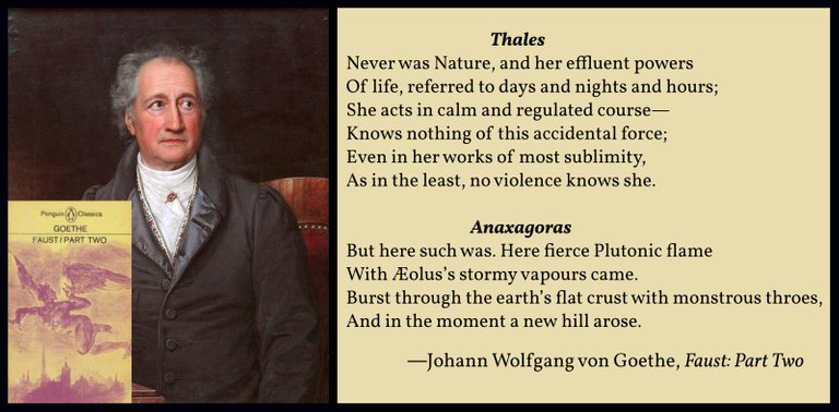 But Neptunism was not a catastrophist theory. In his Faust: Part Two, Johann Wolfgang von Goethe parodies the debate between the Neptunists and the Plutonists when he has two ancient Philosophers, Thales and Anaxagoras, argue over the origins of a rock formation. Thales describes Neptunism as a slow, gradual and gentle process, while Anaxagoras describes Plutonism as violent and sudden. Goethe, who favoured Neptunism, was no catastrophist.